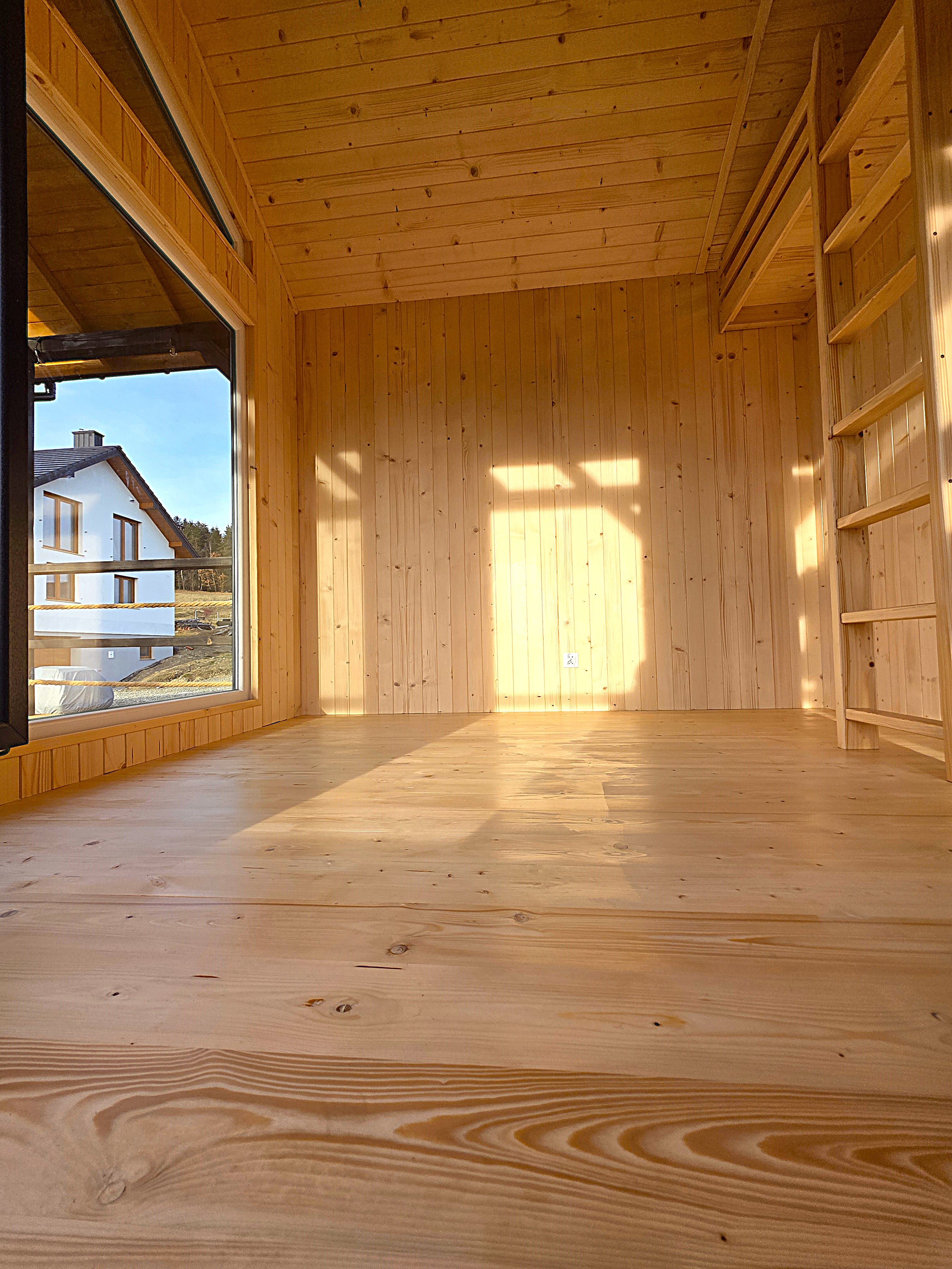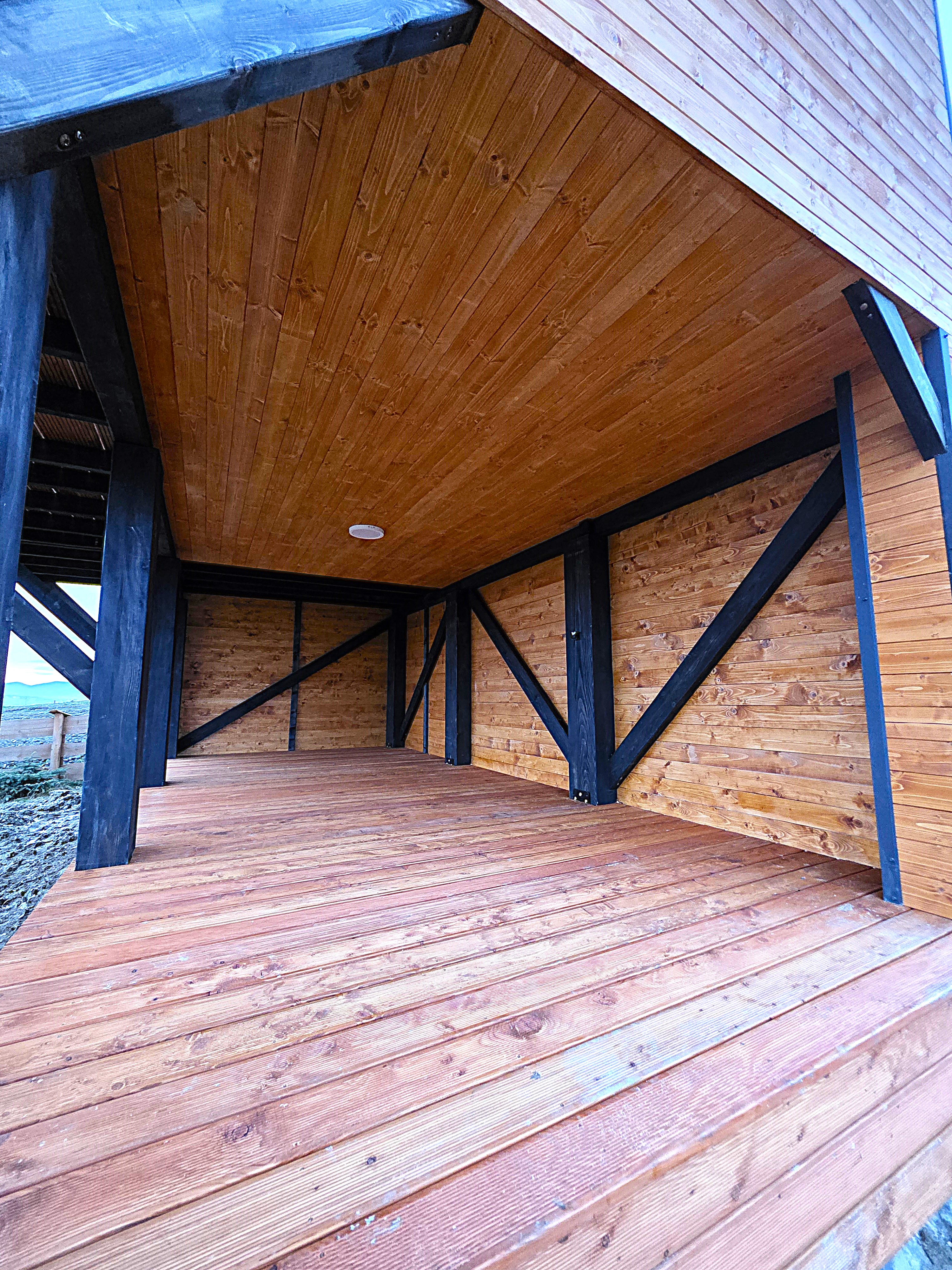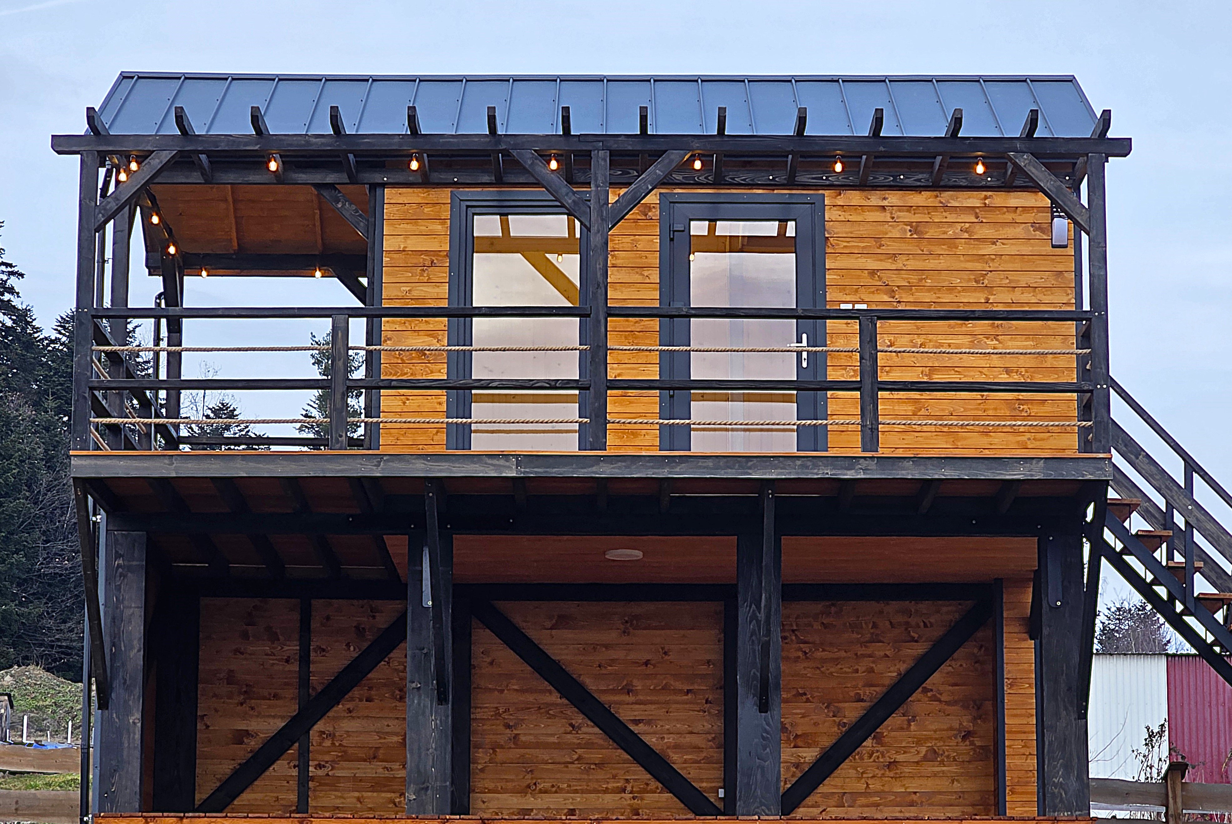 🏡 Bosco – drewniany domek na palach z dużym tarasem i pergolą wyposażony w antresolę, toaletę, instalację elektryczną z oświetleniem LED, panoramiczne okna PCV oraz schody. Pod domkiem znajduje się obszerny taras. Idealny na wypoczynek.