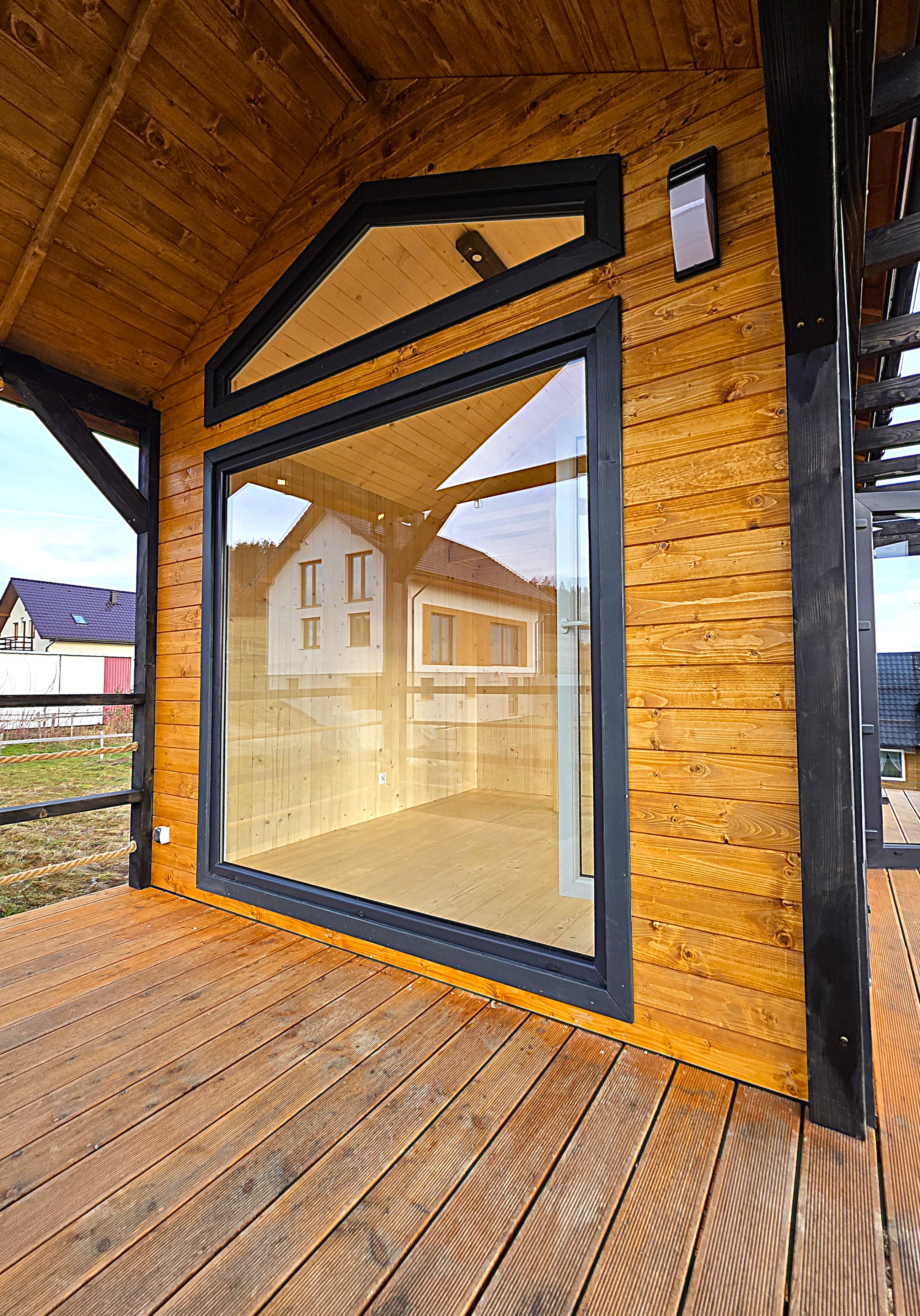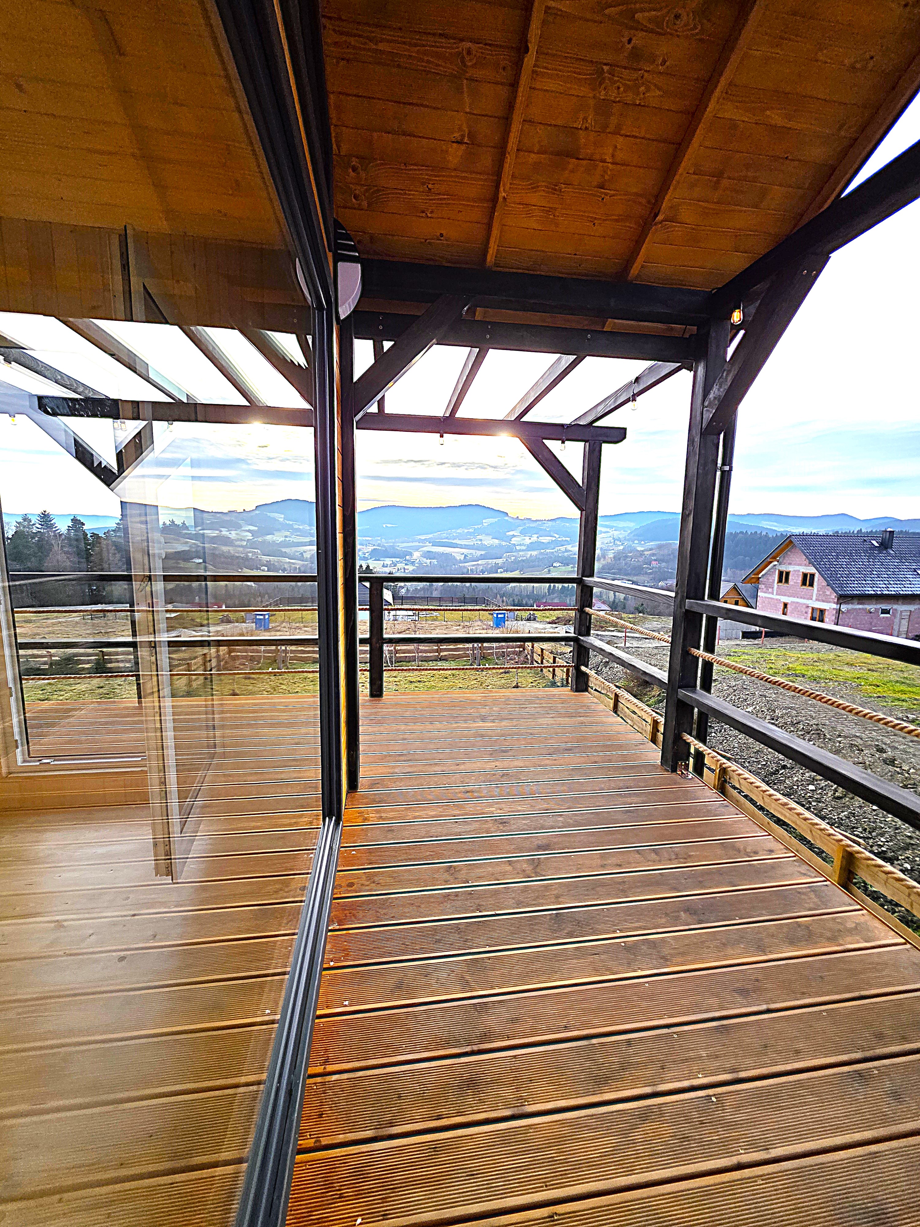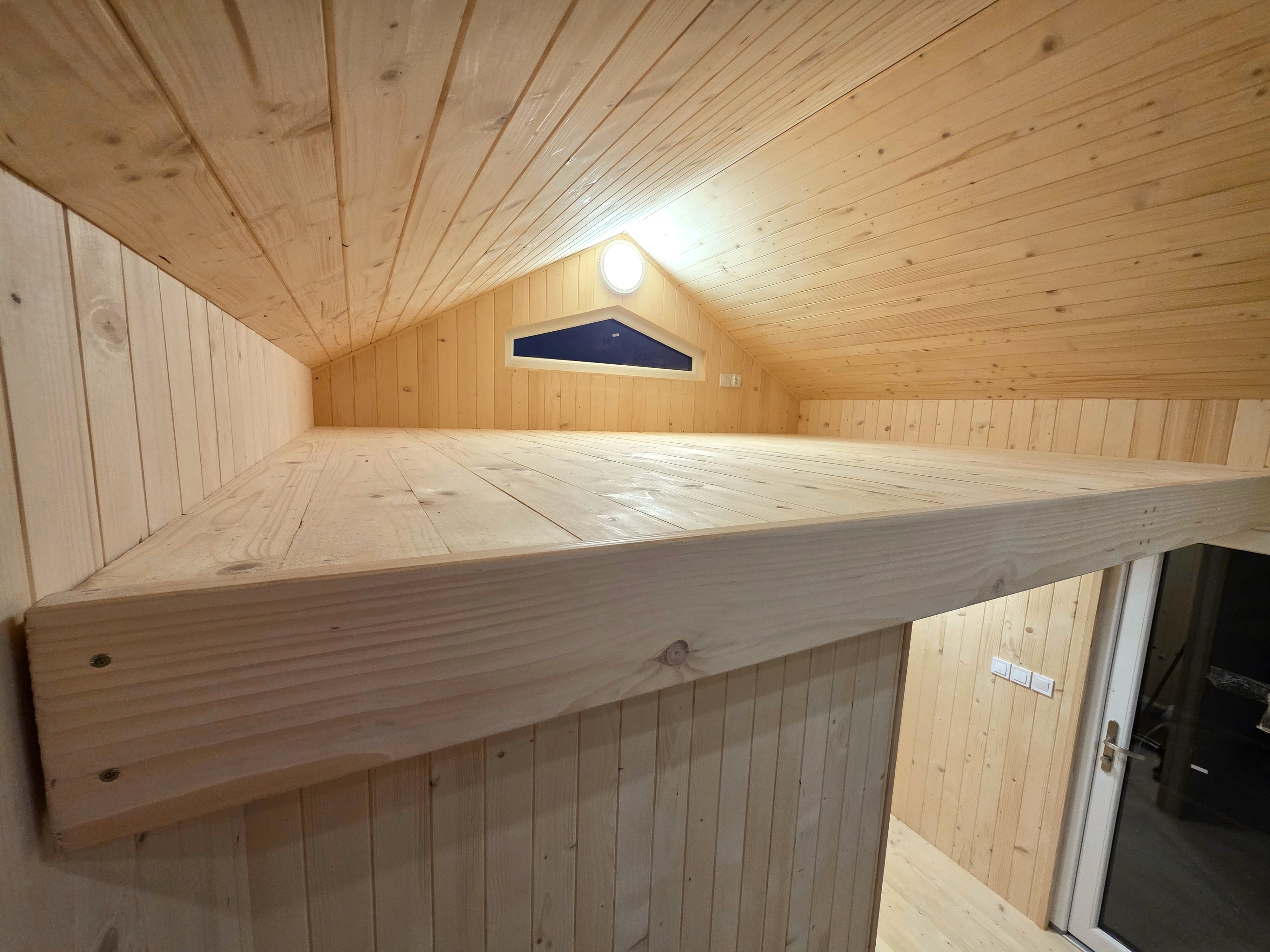 🏡 Bosco – drewniany domek na palach z dużym tarasem i pergolą wyposażony w antresolę, toaletę, instalację elektryczną z oświetleniem LED, panoramiczne okna PCV oraz schody. Pod domkiem znajduje się obszerny taras. Idealny na wypoczynek.
