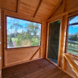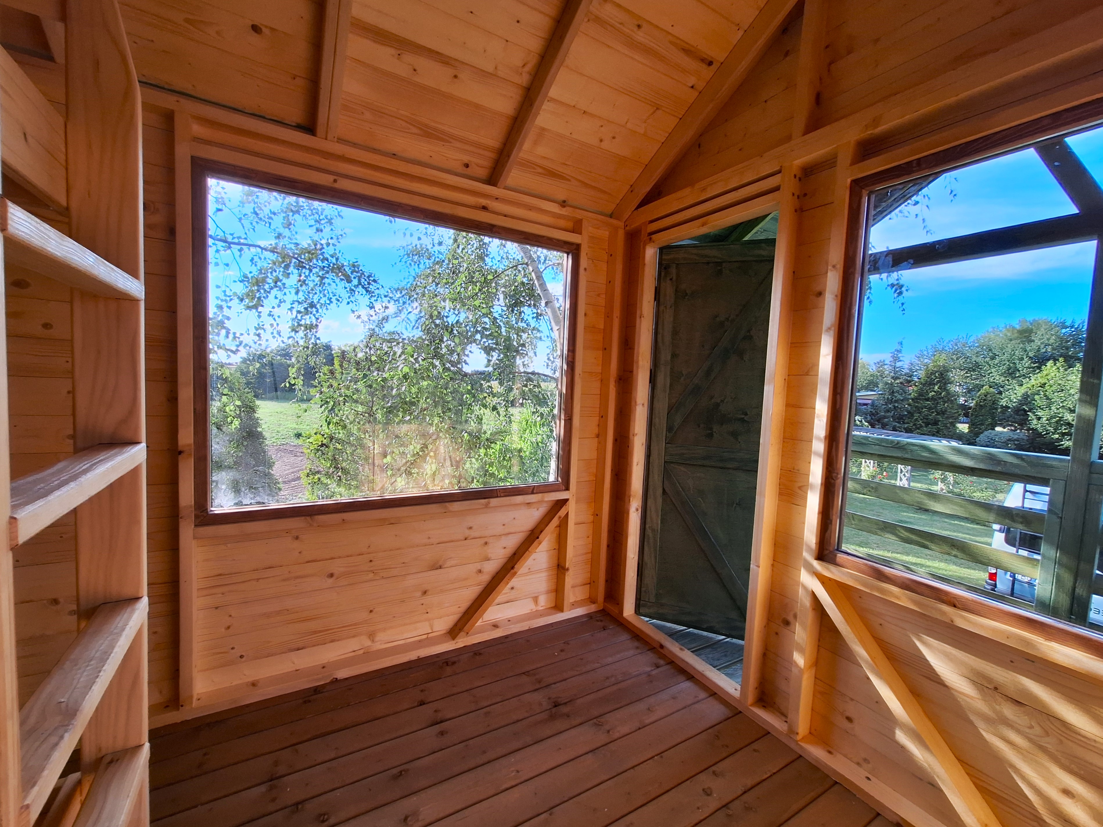 O powierzchni 300x300 cm, z dodatkowym tarasem 300x150 cm, stanowi idealne miejsce do "chillowania" z książką, kieliszkiem wina czy po prostu ze sobą samym. Dwie szklane witryny zapewniają mnóstwo naturalnego światła i pozwalają cieszyć się widokiem otaczającej przyrody, a uchylne okno wpuszcza świeże powietrze w ciepłe dni.