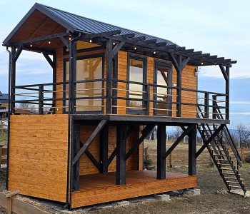 🏡 Bosco – drewniany domek na palach z dużym tarasem i pergolą wyposażony w antresolę, toaletę, instalację elektryczną z oświetleniem...
