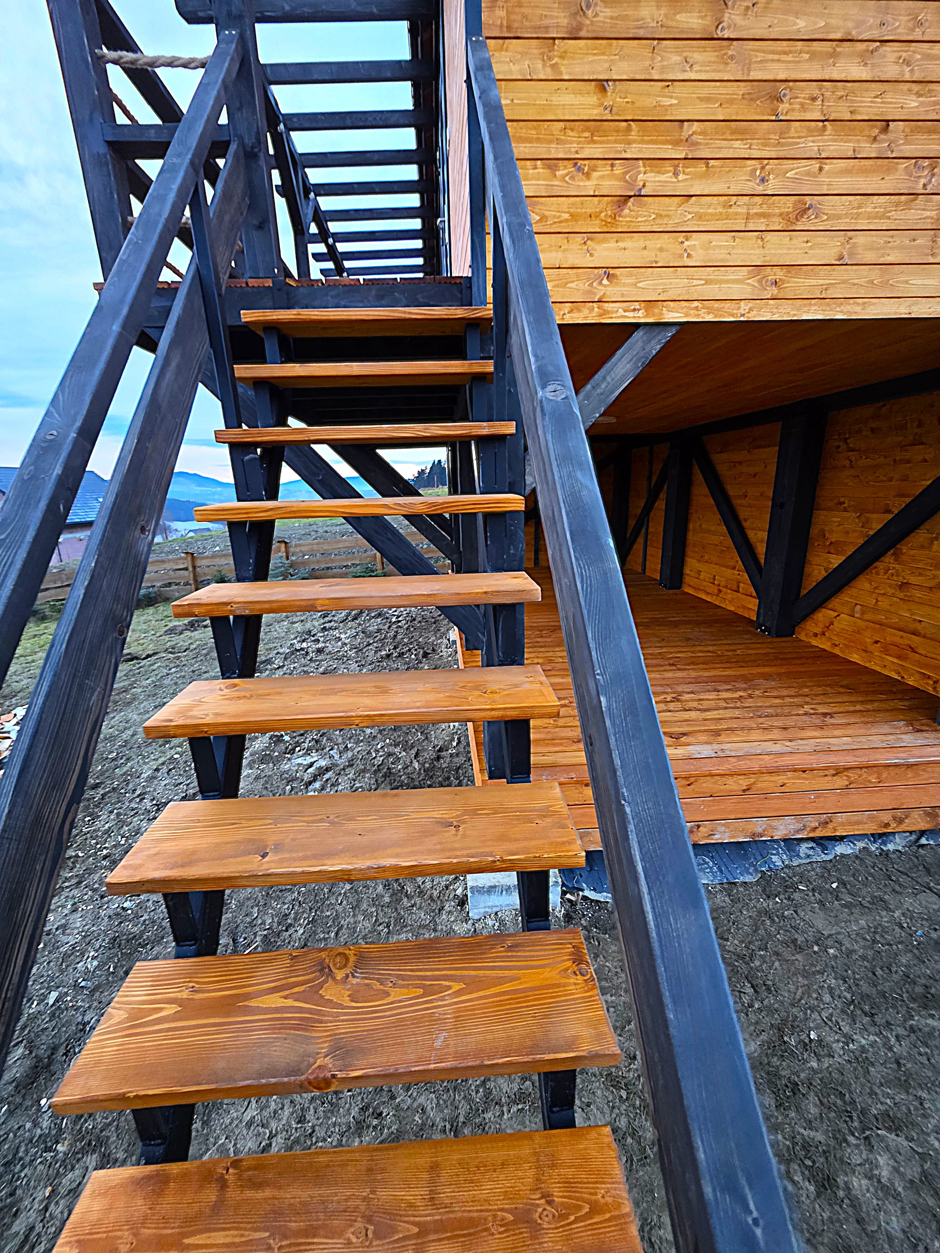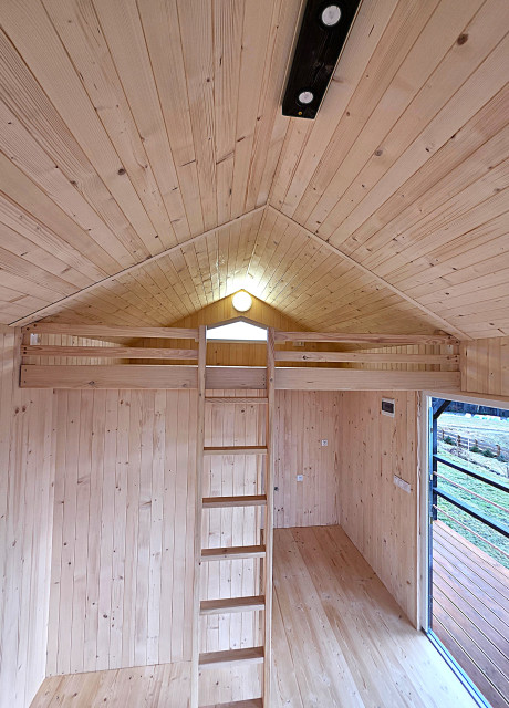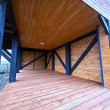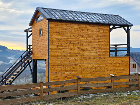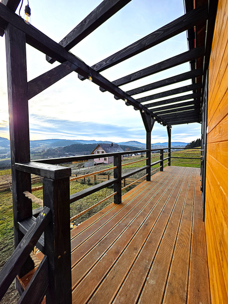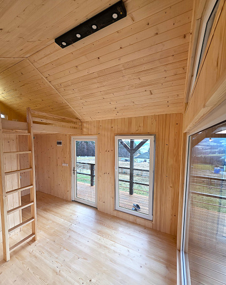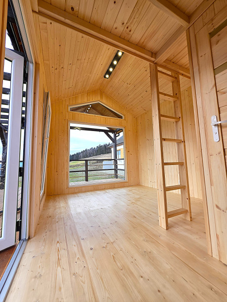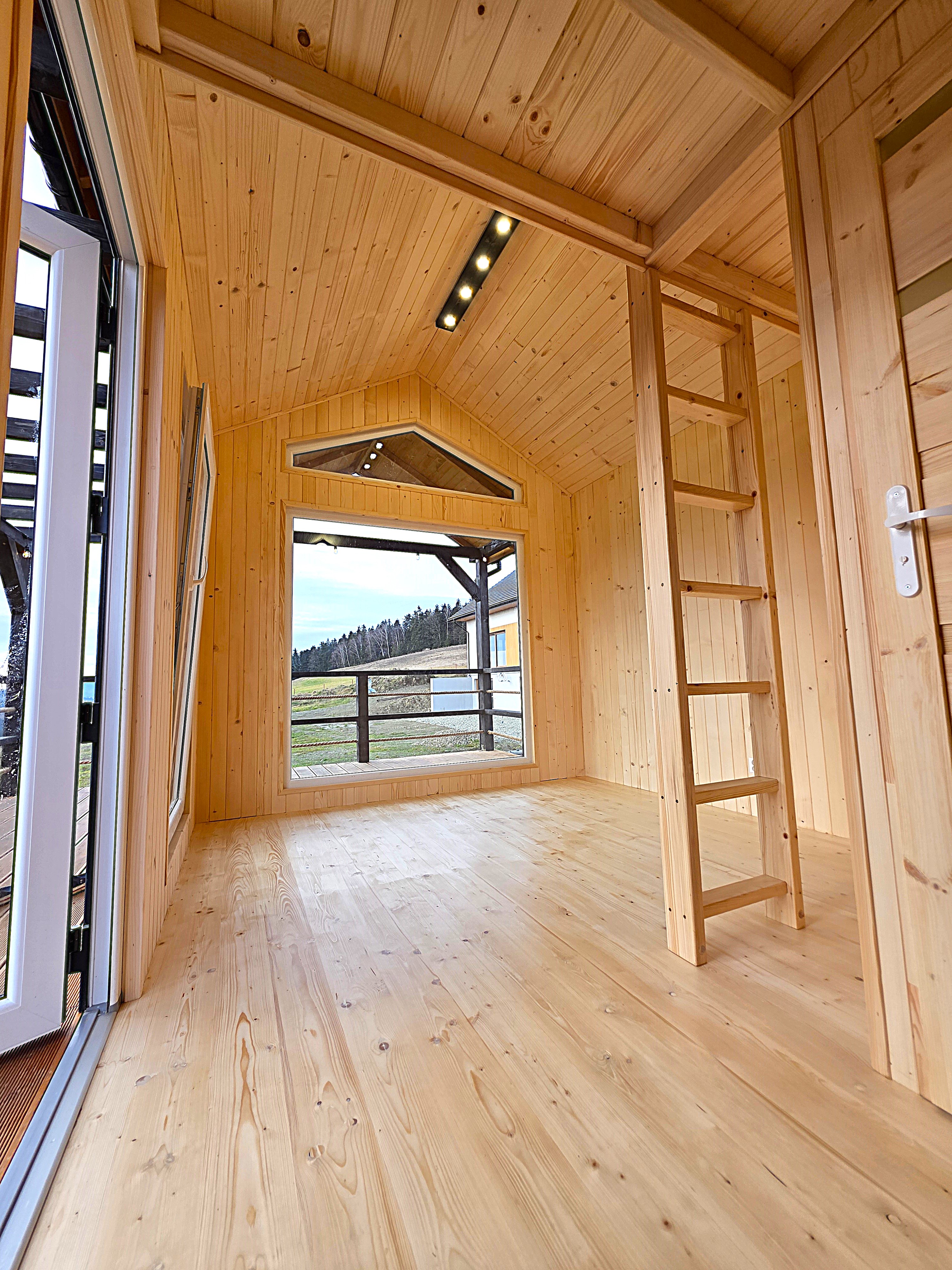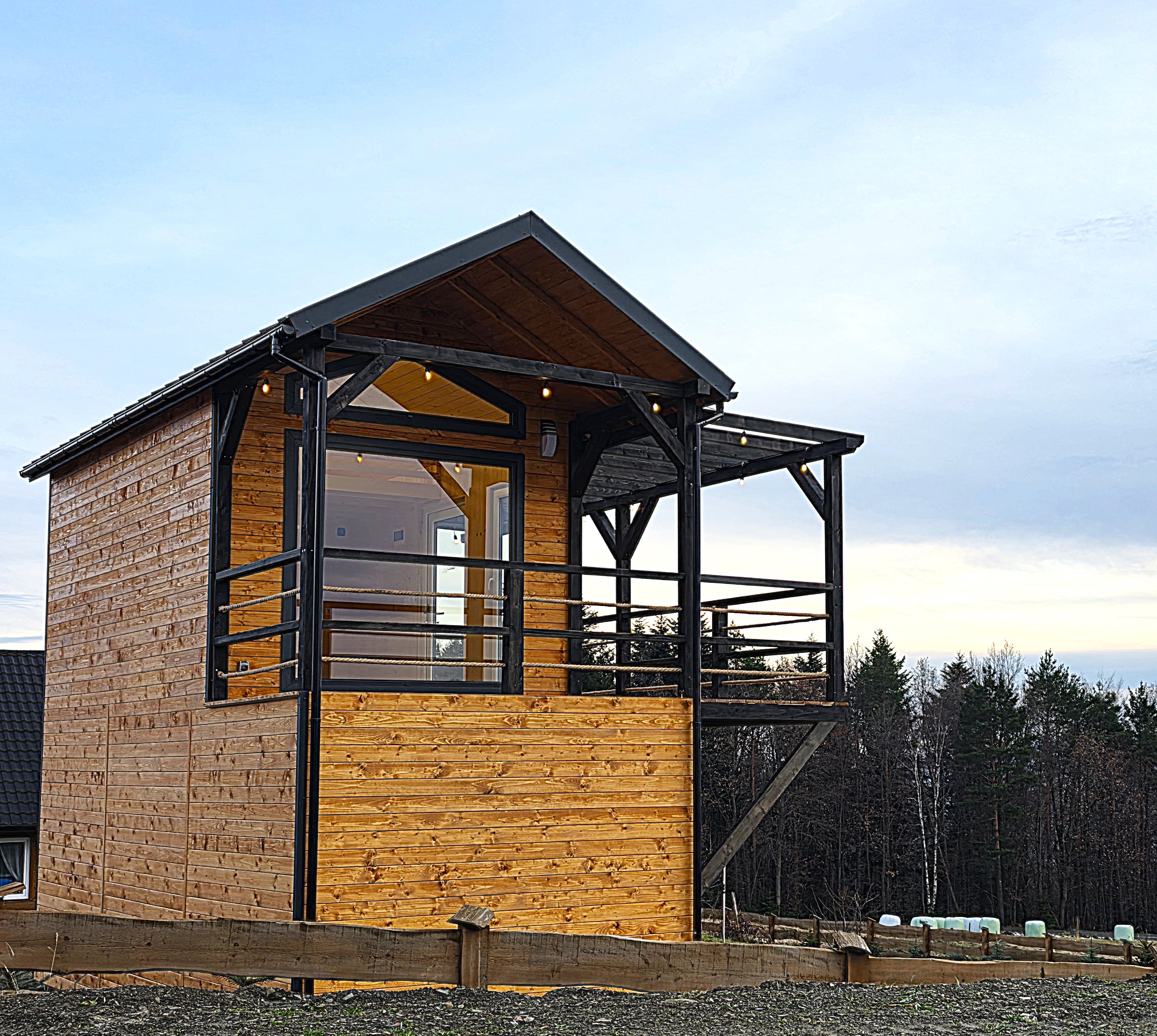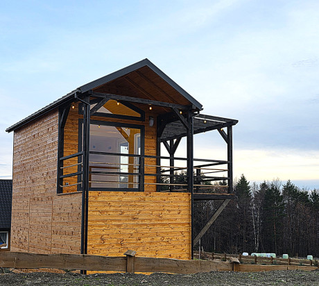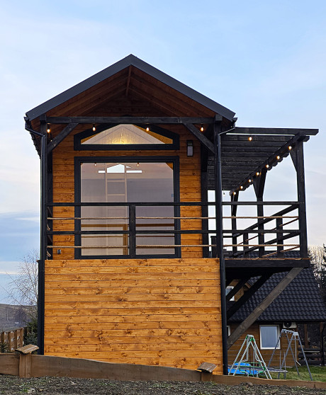 🏡 Bosco – drewniany domek na palach z dużym tarasem i pergolą wyposażony w antresolę, toaletę, instalację elektryczną z oświetleniem LED, panoramiczne okna PCV oraz schody. Pod domkiem znajduje się obszerny taras. Idealny na wypoczynek.