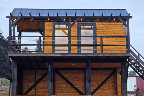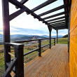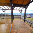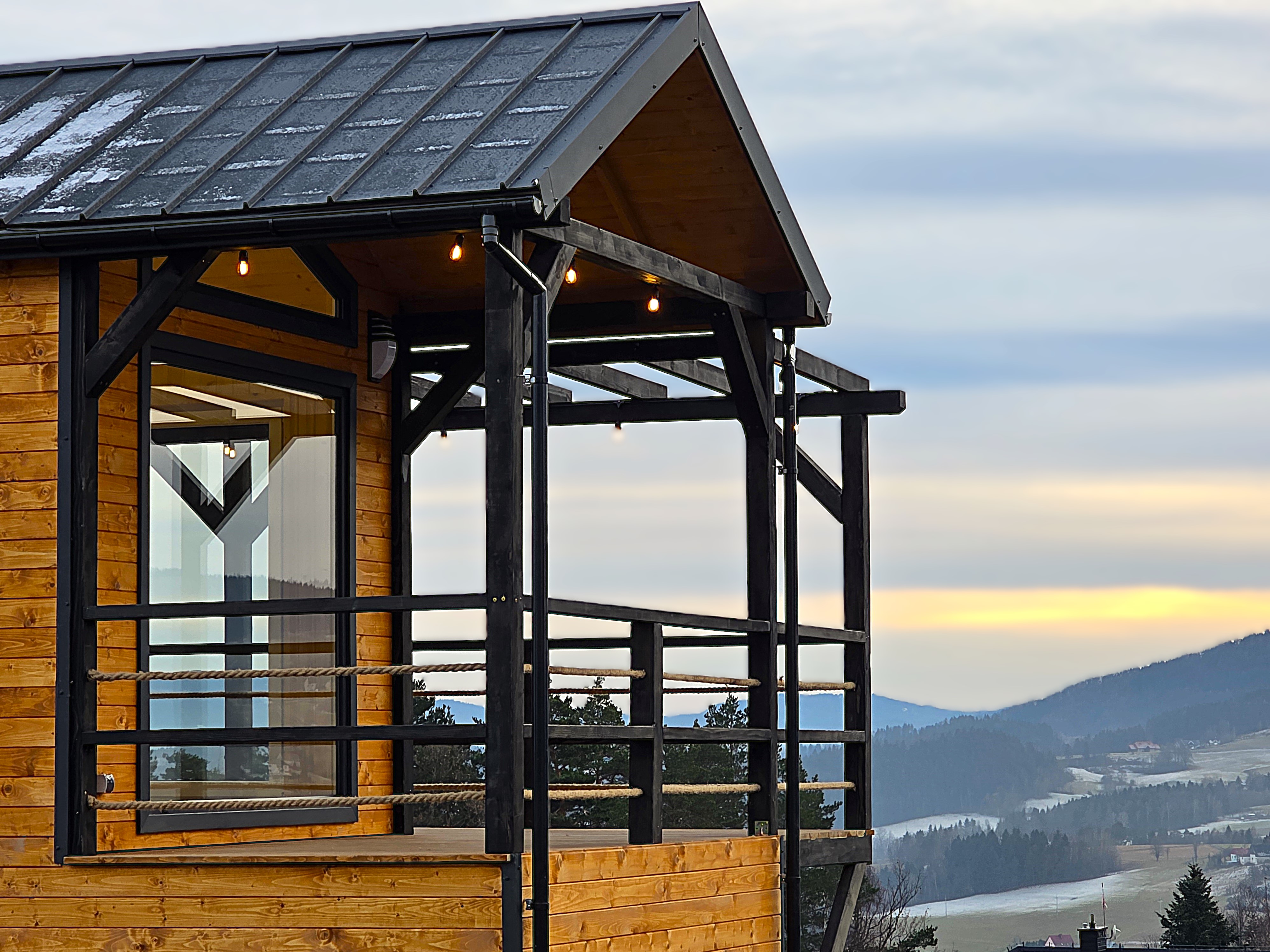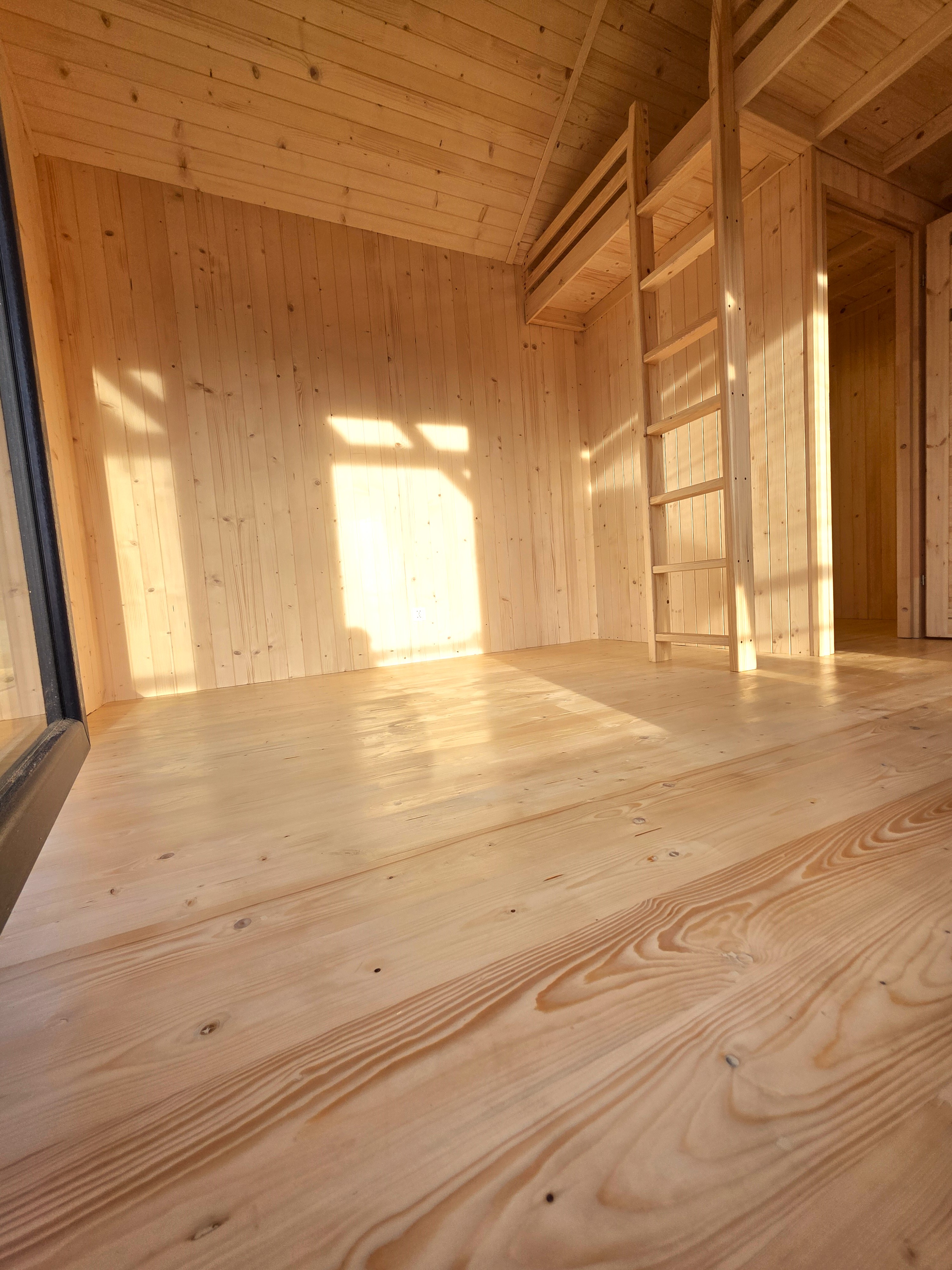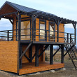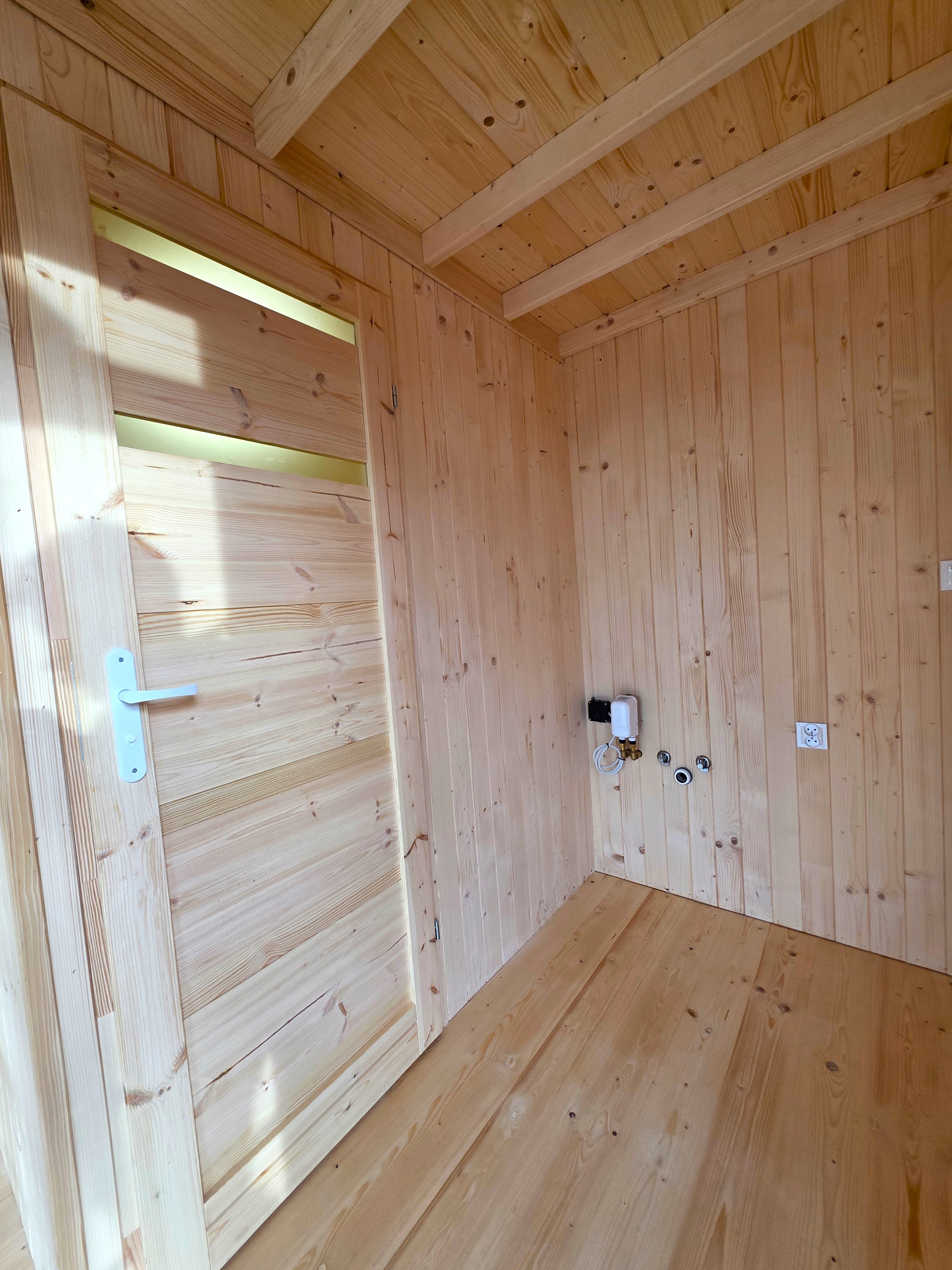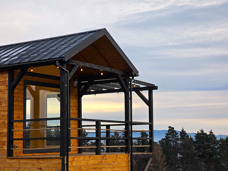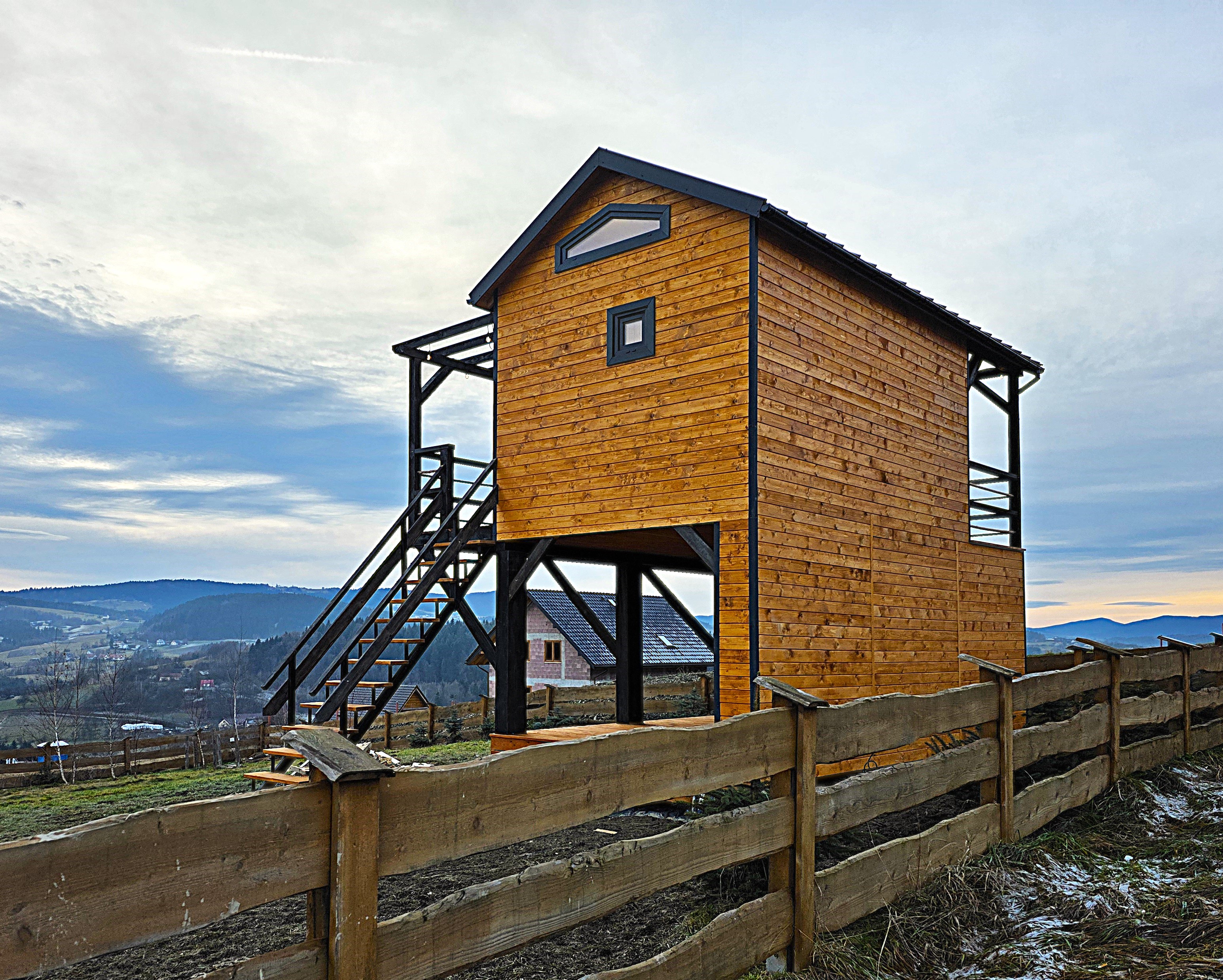 🏡 Bosco – drewniany domek na palach z dużym tarasem i pergolą wyposażony w antresolę, toaletę, instalację elektryczną z oświetleniem LED, panoramiczne okna PCV oraz schody. Pod domkiem znajduje się obszerny taras. Idealny na wypoczynek.