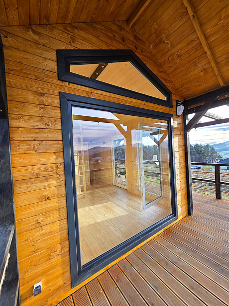 Wymiary domku z zewnątrz 3x5m, taras przed domkiem 3x2m, taras boczny 1,5x7m.