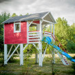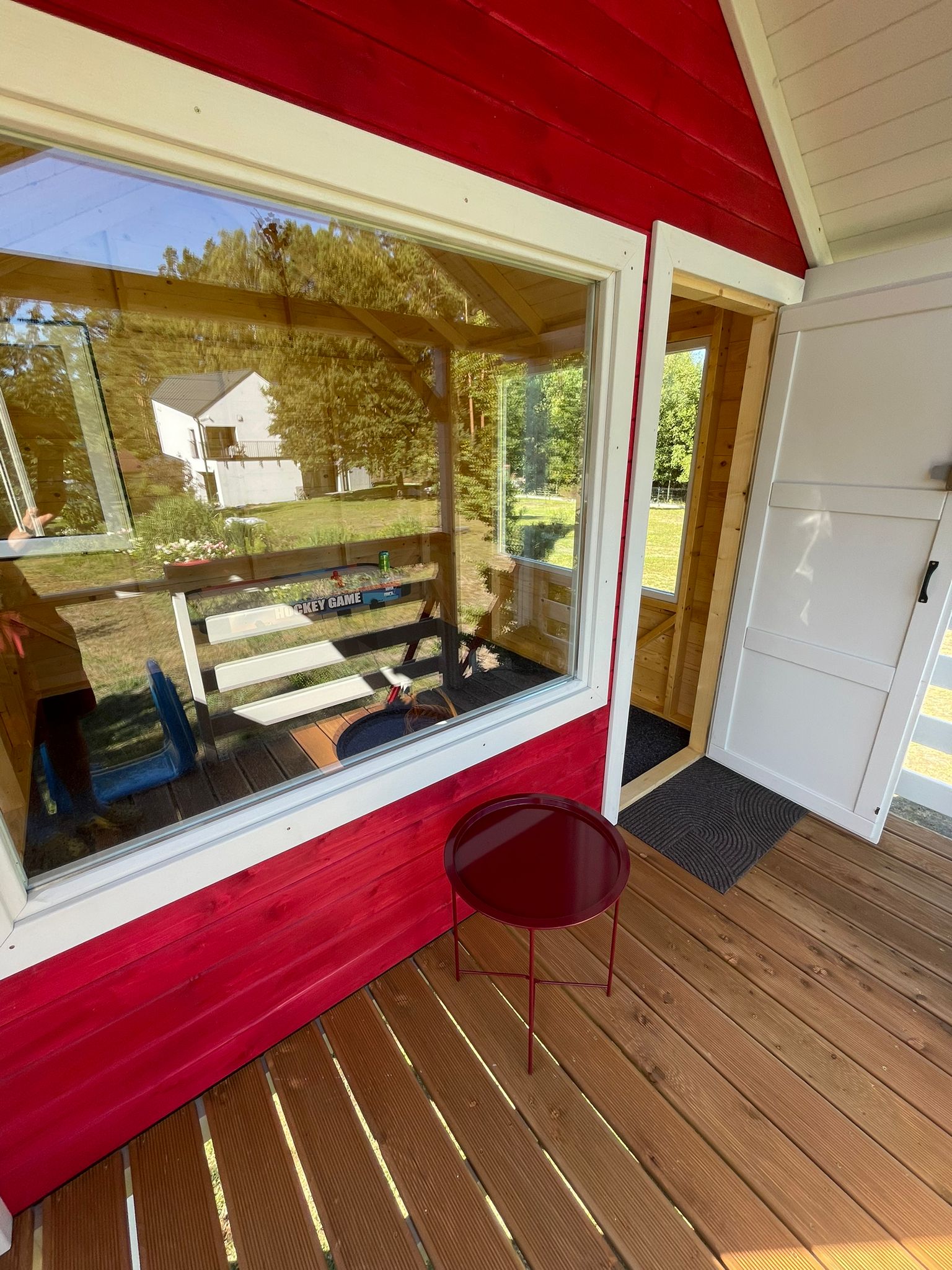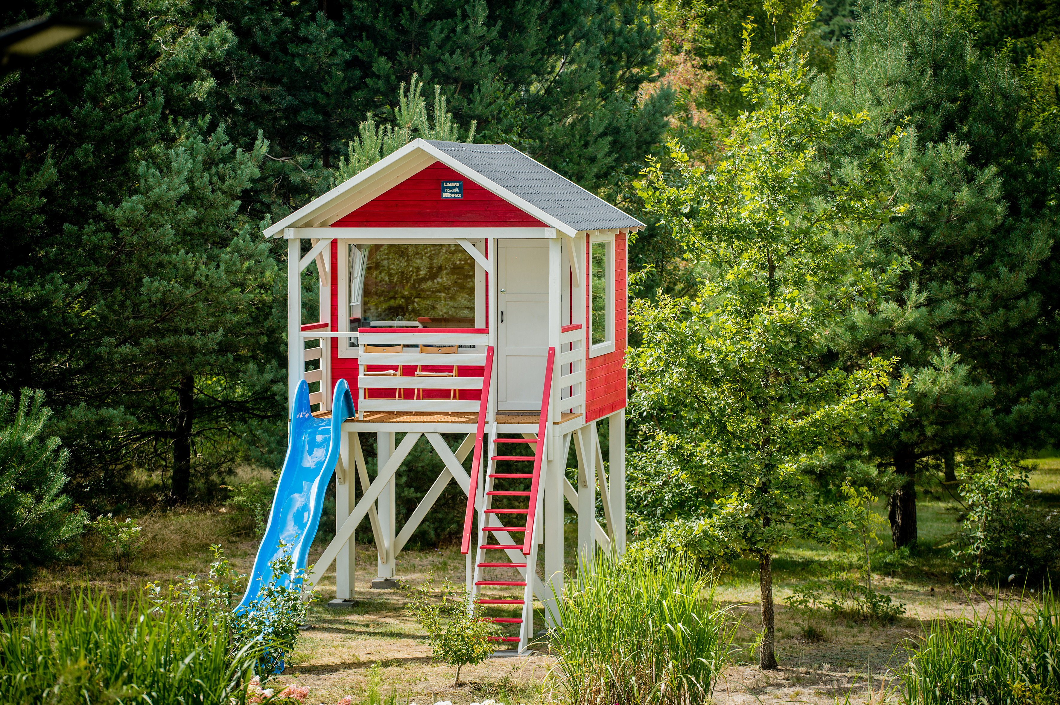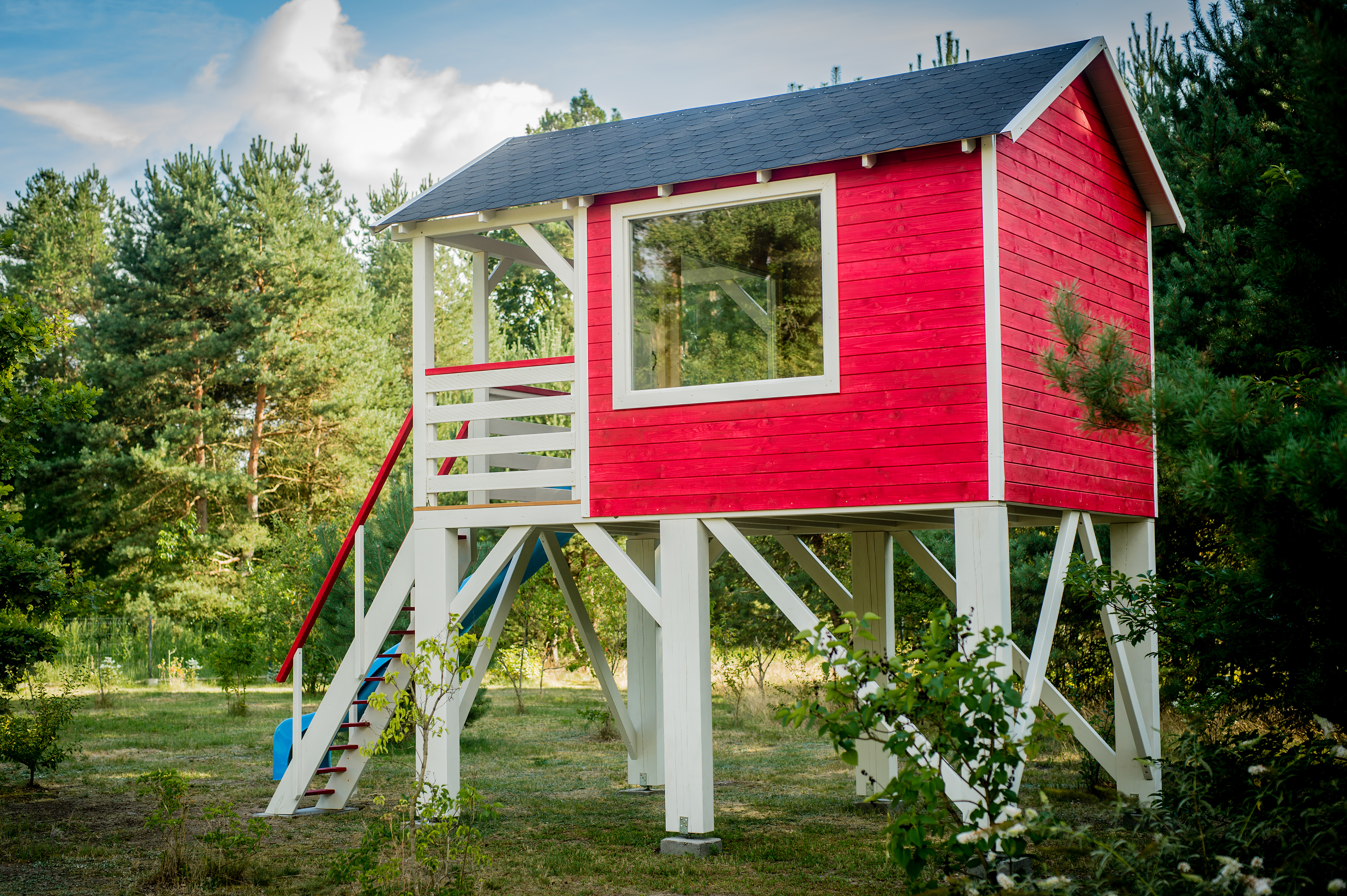 Tym razem ubrany w skandynawski styl: intensywna czerwień kontrastująca z subtelną bielą tworzy harmonijną całość, a całość dopełnia niebieska zjeżdżalnia, która dodaje temu miejscu dziecięcej radości i beztroski. To idealne połączenie estetyki, komfortu i zabawy.