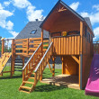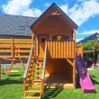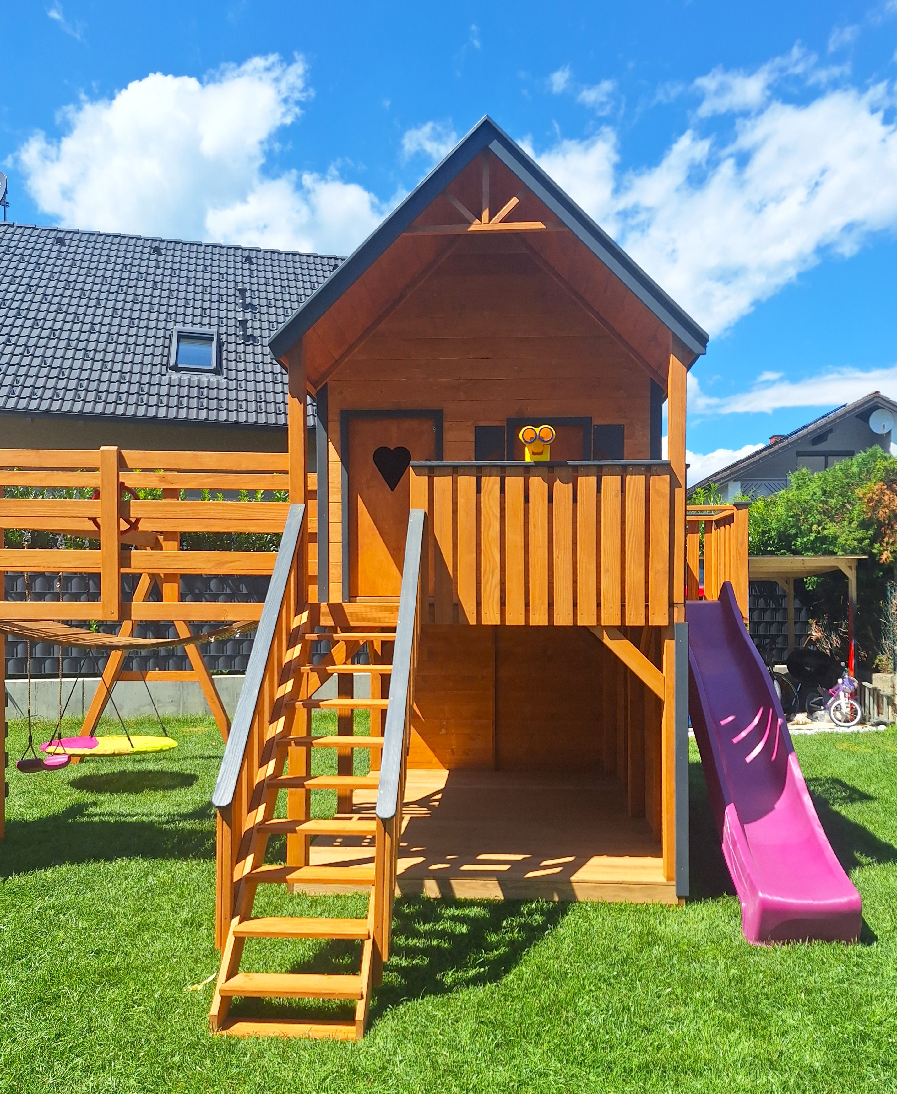 Wyjątkowy domek w góralskim stylu to prawdziwa perła wśród dziecięcych konstrukcji! Jego charakterystyczny dach o ostrym kącie 45° nadaje mu niepowtarzalny, tradycyjny wygląd rodem z gór. Pod domkiem znajduje się przestronny taras, idealny do odpoczynku i wspólnych zabaw. Całość urozmaica most prowadzący do wieży z atrakcjami, która staje się centrum przygód i odkryć. Ten domek to połączenie klimatu górskiej chaty z niezwykłym światem zabawy, który rozbudza wyobraźnię i zachęca do aktywności na świeżym powietrzu.