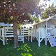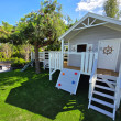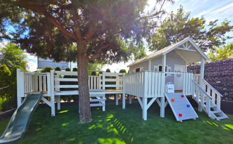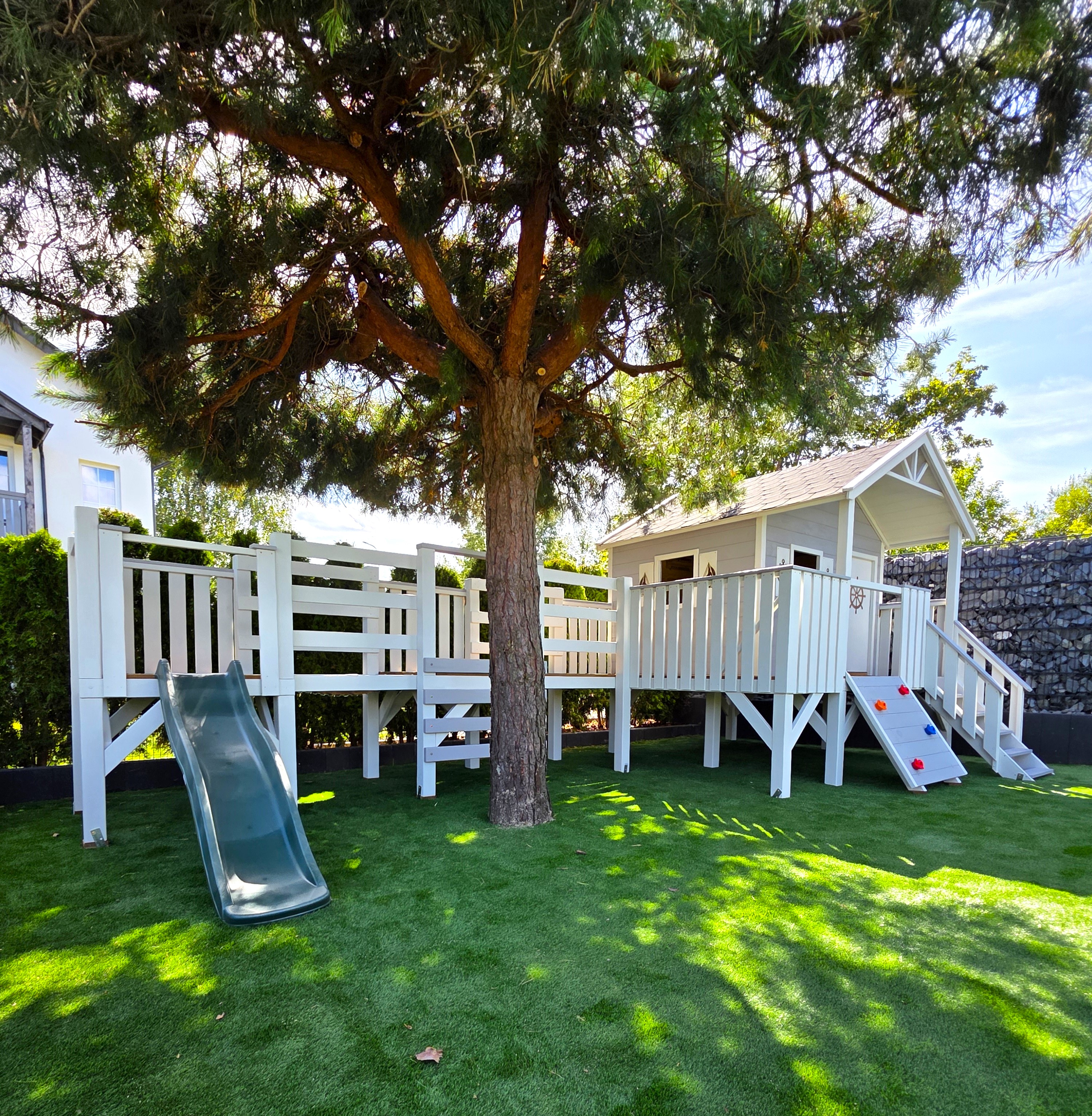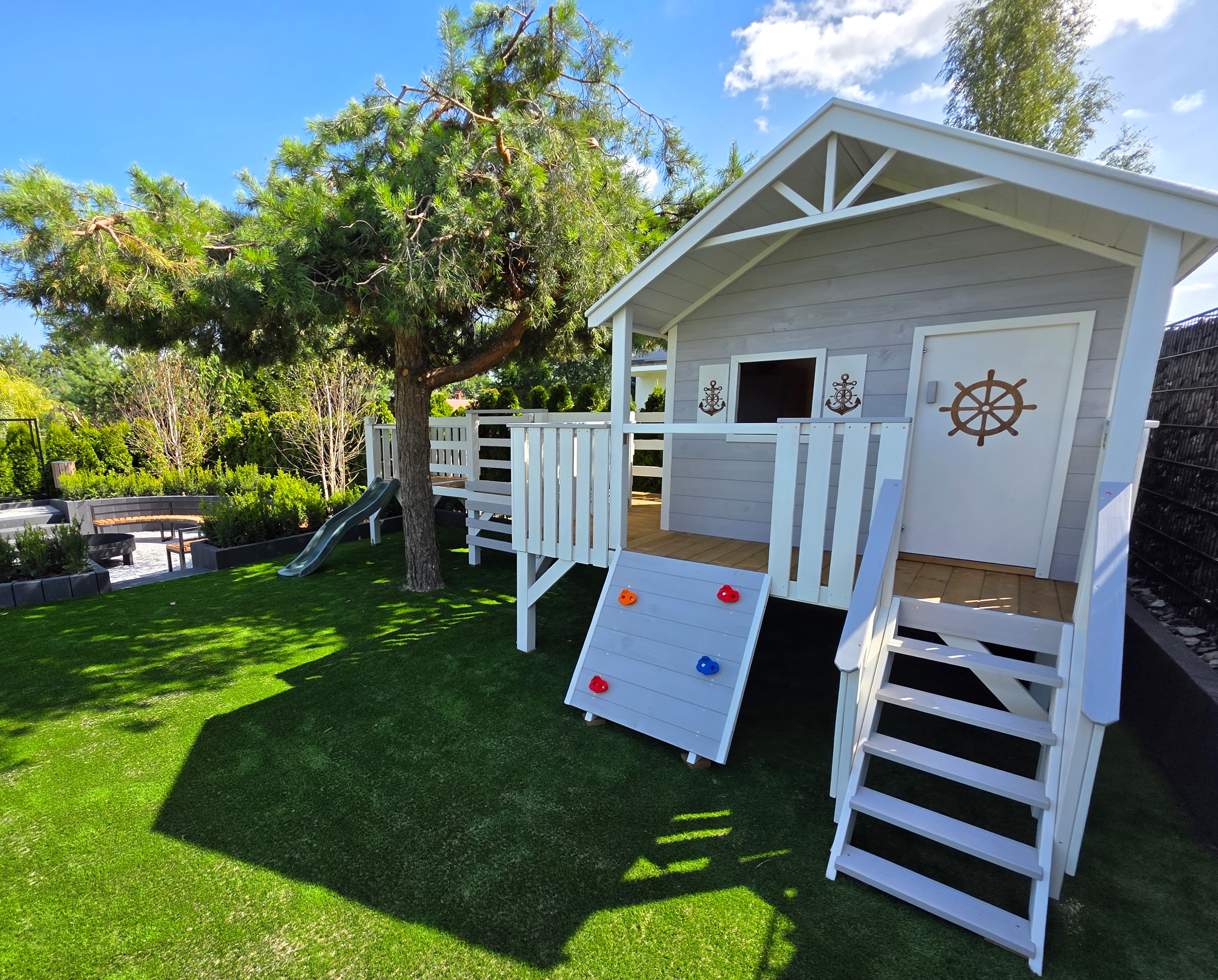 Wyjątkowy domek nad morzem, który harmonijnie łączy naturę z marynistycznym klimatem. Schowany pod rozłożystą koroną drzewa, oferuje naturalny cień idealny do zabawy w letnie dni. Detale takie jak kotwica, ster i żaglówka nadają mu niepowtarzalny charakter i przenoszą dzieci w świat morskich przygód.