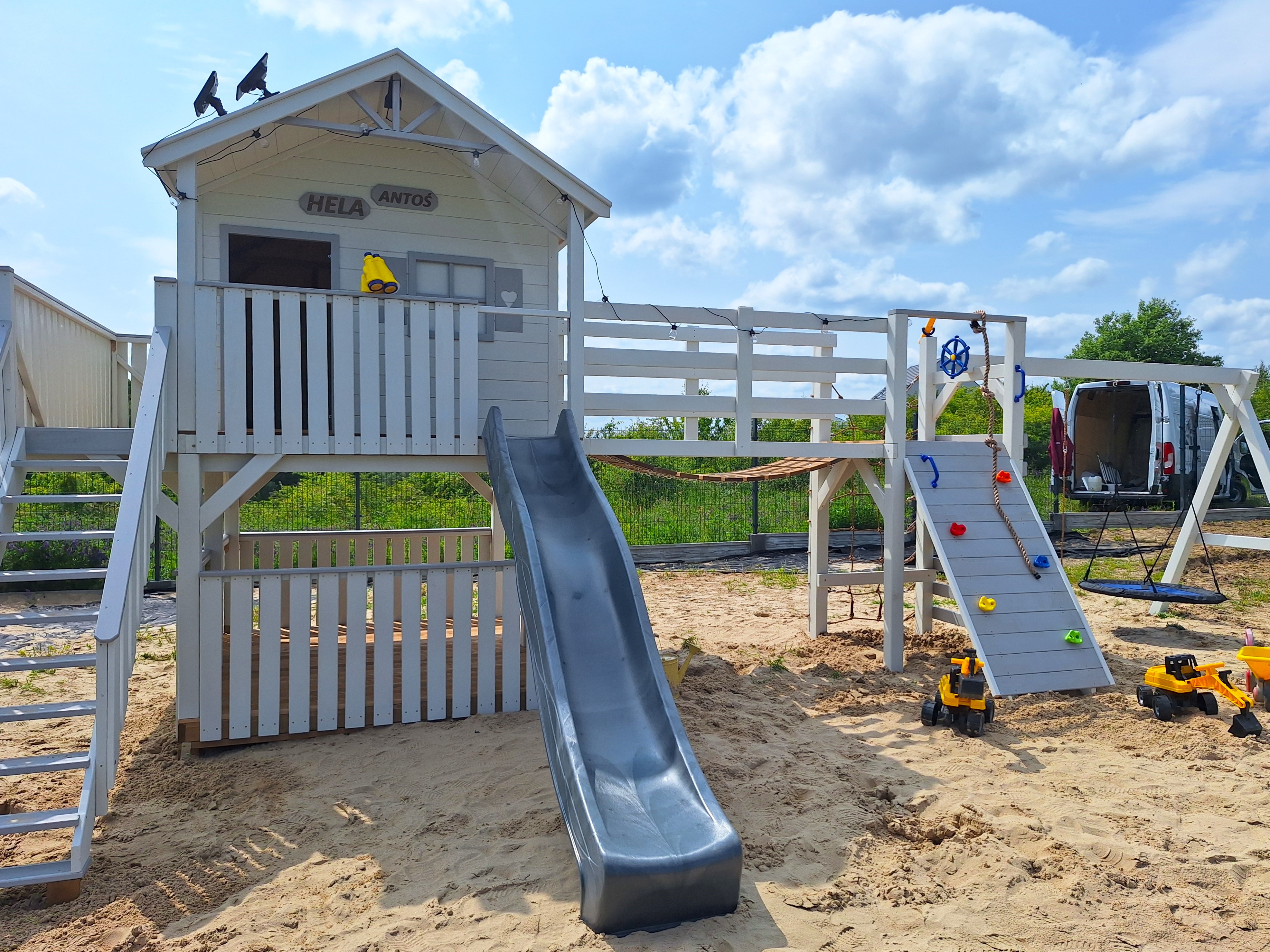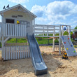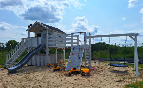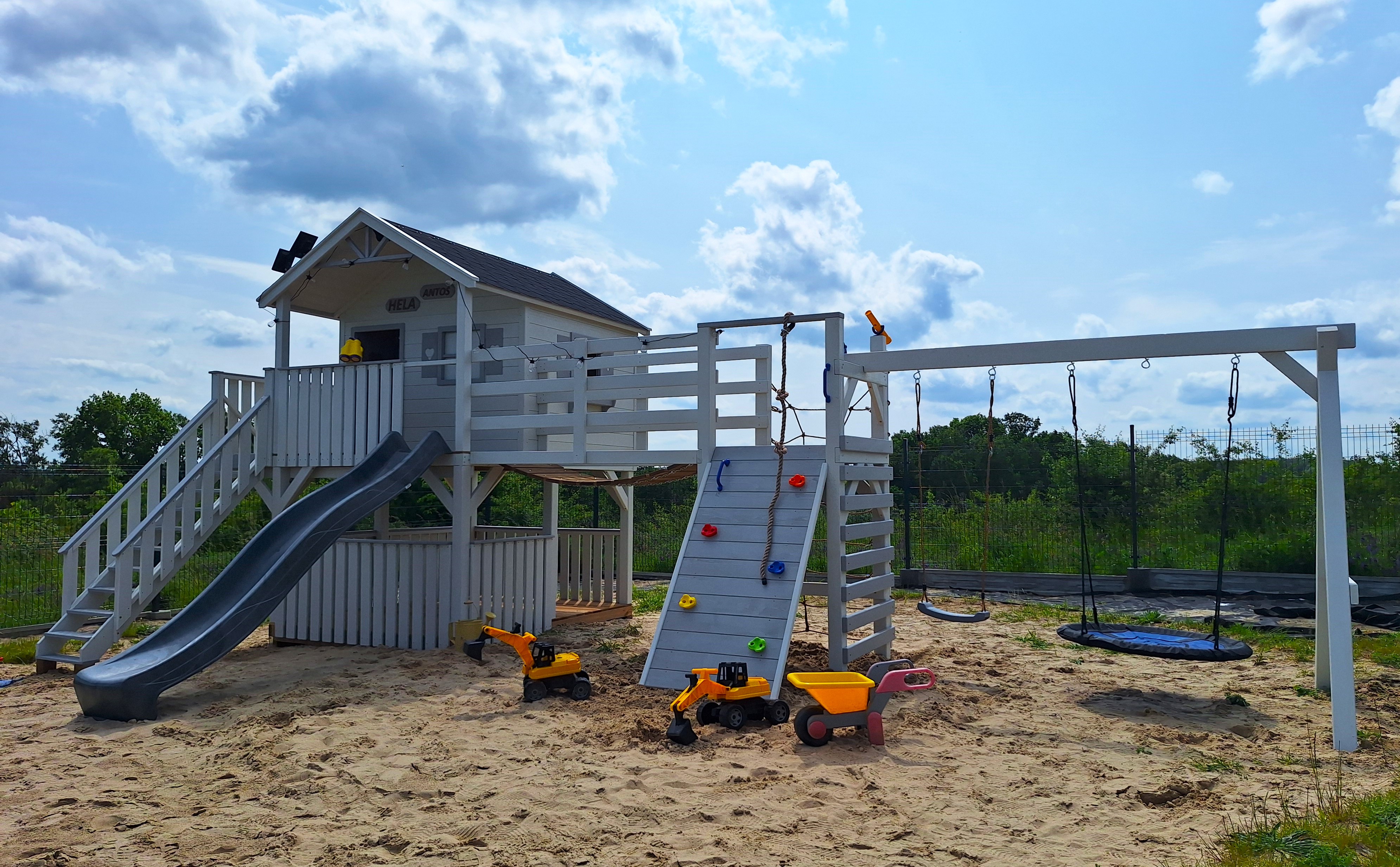 Kolejna odsłona popularnego zestawu Sahara! Tym razem domek zyskał elegancką biało-szarą kolorystykę, która nadaje mu nowoczesnego i stylowego charakteru. Całość została ustawiona w dużej piaskownicy, tworząc idealną przestrzeń do zabawy i odpoczynku. To harmonijne połączenie funkcjonalności z estetyką, które zachwyci zarówno dzieci, jak i dorosłych.